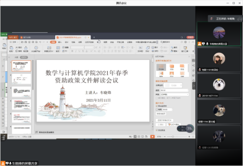 3月11日晚8点,学院利用腾讯会议室召开学生春季资助政策宣讲会。会议由学院学生资助工作专员、辅导员车晓锋老师主持,张艺、施堂怡两位老师和390多名上一年秋季认定的家庭经济困难学生参加。