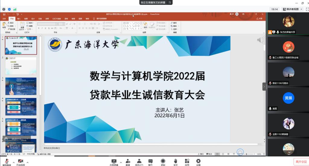 为帮助2022届贷款毕业生掌握还款流程和政策,加强贷款毕业生诚信教育,6月1日晚,学院通过腾讯会议平台召开2022届贷款毕业生诚信教育会议。会议由学院负责贷款专项工作的辅导员张艺老师主讲,学院2022级贷款的全体毕业生参加。