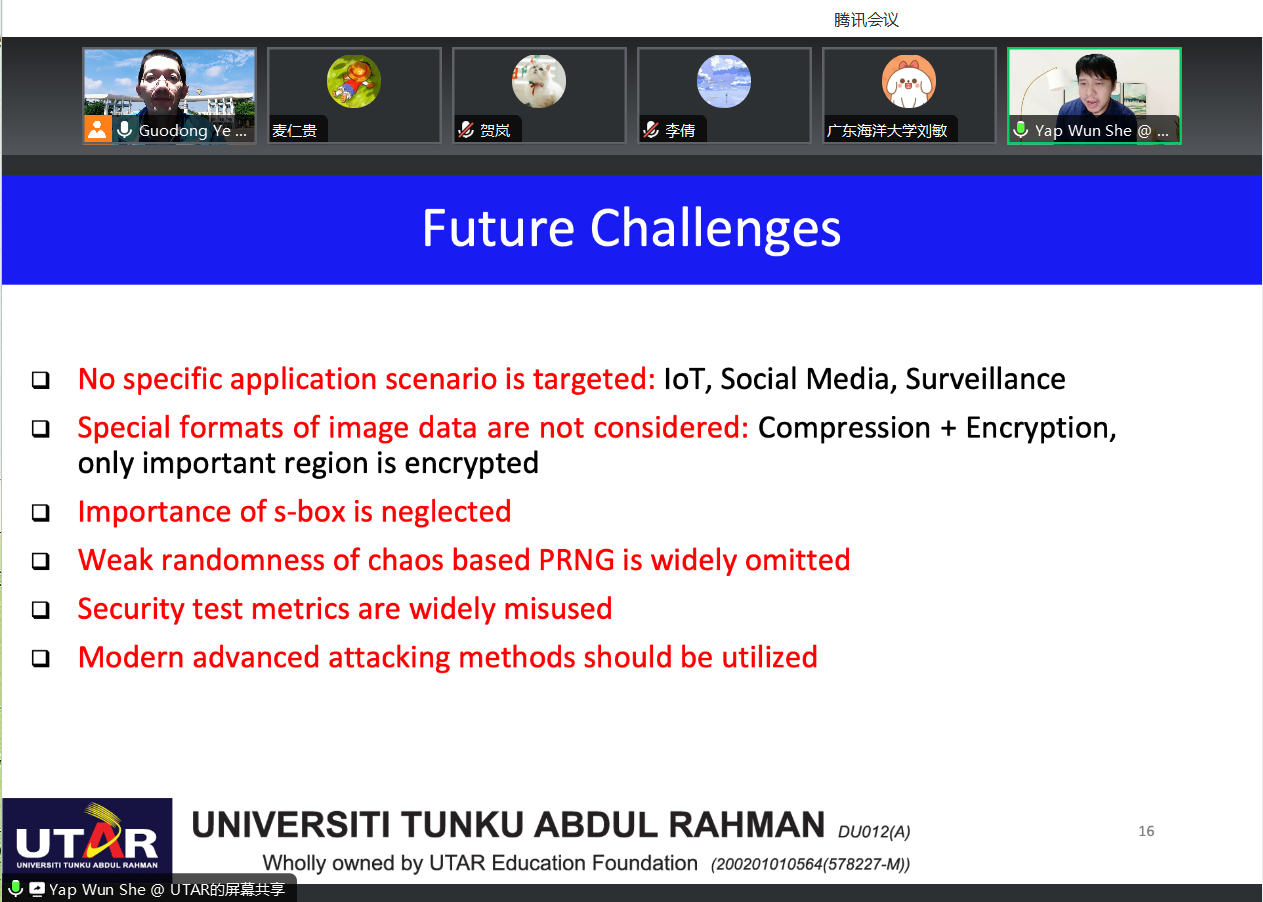 12月16日下午,应学院邀请,马来西亚拉曼大学院长Wun-She Yap博士以《Chaos-based cryptosystems: Basic Requirements and Lessons Learnt》为题,为我院师生作了一场线上学术报告,20多名师生在线聆听了报告。