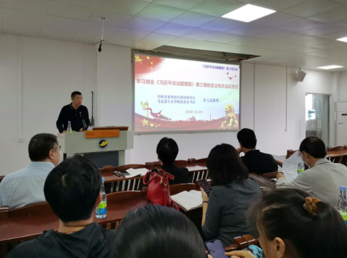 党委在第二教学楼A103会议室召开《习近平谈治国理政》第三卷宣讲报告会。本次宣讲报告会由学院党委书记谢仕义主持,马克思主义学院党总支书记、学校党委理论宣讲团副团长宋玉忠教授主讲,学院全体教职工参加。