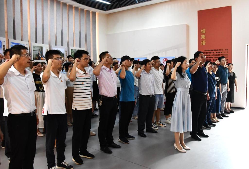 参观完廉政教育基地,学院一行观看了廉政警示教育片《假面》,该片展示了我市个别党员领导干部违纪违法案件,通过当事人现身说法,警醒党员干部要以案为鉴,时刻自警自省,做到警钟长鸣,自觉筑牢拒腐防变思想防线。随后,在龙俊的带领下,全体党员面对党旗重温了入党誓词。