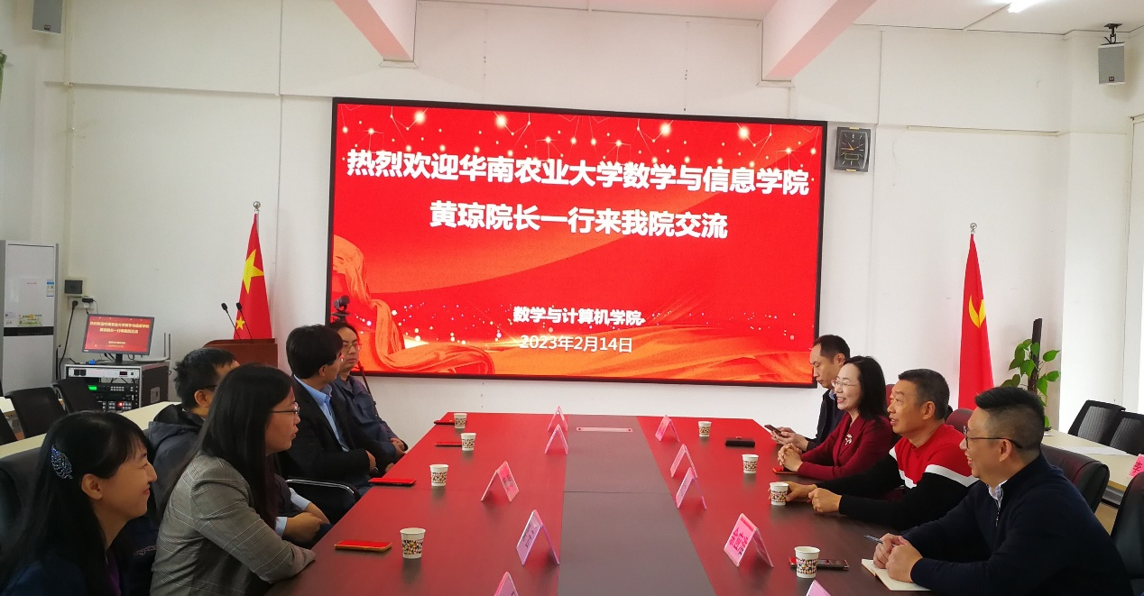 2月14日上午,华南农业大学数学与信息学院院长黄琼教授一行五人到访我院。我院院长彭小红教授、党委书记谢仕义教授、计算机科学与技术系主任余应淮、软件工程系主任陈小瀚等人在第二教学楼A405会议室与来宾进行了座谈交流。会议由彭小红院长主持。