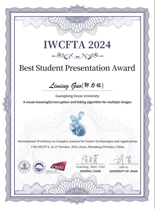 本次会议分为大会邀请报告和分会场报告,来自加拿大滑铁卢大学、意大利国家科学院复杂系统研究所、印度坎普尔理工学院、香港城市大学、东北大学、哈尔滨工业大学、中南大学、湖南大学、济南大学、广东海洋大学等国内外82所高校和科研单位300多位专家学者参会,现场报告的学术论文共115篇。由于表达能力较强和语言表述较清晰,经会议推荐,郭力铭同学的报告被评为IWCFTA2024“最佳学生报告奖”,其指导教师为叶国栋教授。