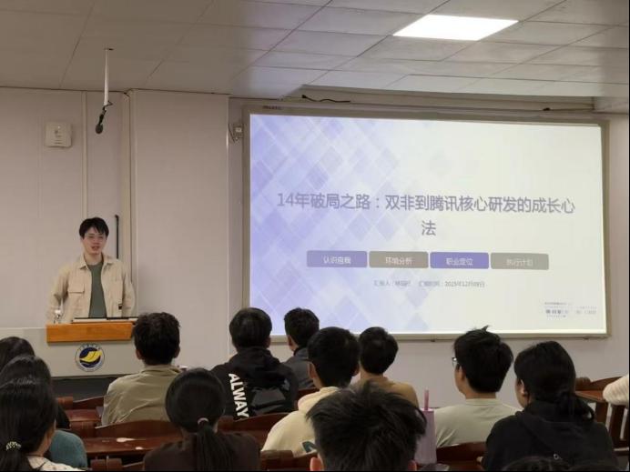 分享环节,林瑞柠结合自身从基础开发到技术架构主导的进阶历程,详解了全球热门手游的技术架构设计逻辑、核心算法优化思路,以及研发过程中问题解决的关键路径。他围绕“三次能力迭代”,分享了技术持续升级的方法,剖析了行业对专业人才的核心要求,建议同学们夯实编程基础、注重跨学科知识融合。陈镕浩聚焦“深耕热爱领域,实现学术与价值共生”,分享了跨学科保研、从计算机视觉转向大模型研究的学术探索经历。他结合科研实践,探讨了人工智能领域的研究热点与发展趋势,强调“极致追求”在学术研究中的重要性,鼓励同学们找准研究方向,在热爱的领域深耕细作,以专业能力创造价值。