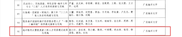 近日,广东省人力资源和社会保障厅、广东省教育厅联合印发《关于表彰全省学校(高等教育)优秀教学成果奖的决定》。由我院院长彭小红教授作为第一完成人申报的《海洋特色计算机类新工科人才培养模式改革与实践》荣获高等教育(本科)省级教学成果奖一等奖。这是我院首次作为第一完成单位获得省级教学成果奖,也是学院在本科教育教学改革领域取得的标志性成果。