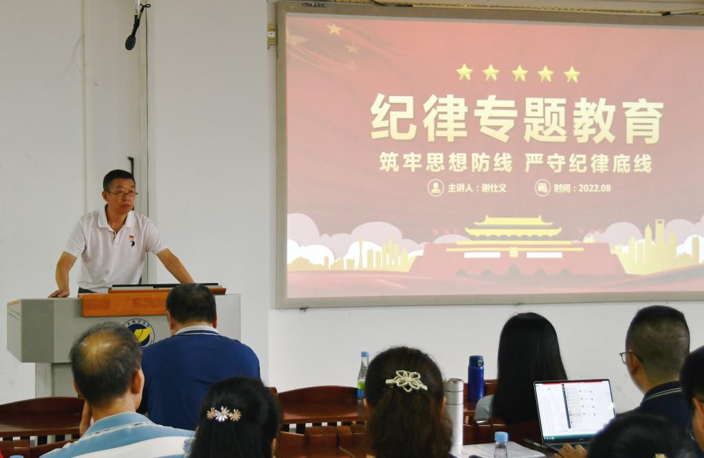谢仕义从活动主题、教育内容、工作安排等方面,对学院2022年纪律教育学习月活动进行了全面部署,并从强化主体意识、加强组织领导、紧密结合工作实际、增强教育实效、做好信息报送等方面提出了四点具体工作要求。随后,他以“筑牢思想防线 严守纪律底线为题作专题辅导报告。他详细诠释了作为一名共产党员应如何在思想境界上强化“四种”意识,在道德修养上做到“五慎”,在实际行动上把好“三关”。他指出清正廉洁是中华民族的传统美德,也是我们党的优良传统,学院全体党员干部要在政治上跟党走、经济上莫伸手、作风上解民忧、工作上争上游,坚定理想信念,实现人生价值,以实际行动迎接党的二十大胜利召开。