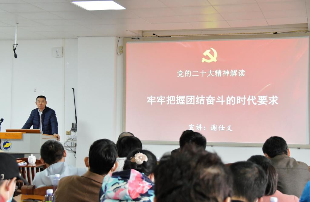 谢仕义以《牢牢把握团结奋斗的时代要求》为题,对党的二十大精神进行了深入阐述。他指出“团结奋斗”是贯穿党的二十大报告的一个主题词,是贯穿党百年历程的一项重要启示,在新时代新征程中具有更加重要的现实意义。他分析了学院的发展现状,强调全体教职工要不忘初心、牢记使命,围绕中心服务大局,谱写学院发展新篇章,必须强化思想政治引领,筑牢团结奋进的思想根基;必须服从学院发展大局,推动学院高质量发展;必须守望相助共克时艰,形成团结奋进的强大合力;必须增强责任感使命感,培养高素质合格人才;必须坚持教师学生为本,凝聚学院工作的强大动力;必须干事创业敢于担当,身先士卒取信于民做大贡献。